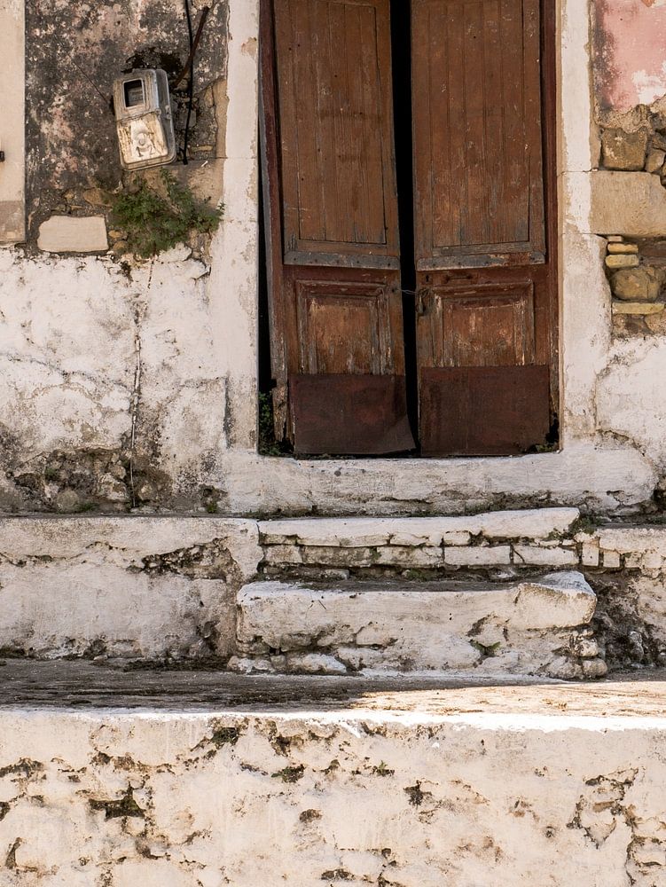 Tür, Rahmen, Tür (Durchgang), Rost (Metall), Urbex, Verfall, Verlassen, Vernachlässigt, Charakteristisch, Authentisch, Kalkstein, Beton, Blau (Farbe), Braun (Farbe), Rot (Farbe), Griechenland