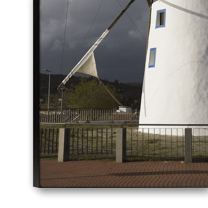 Diese wunderschön restaurierte Windmühle aus dem 19. Jahrhundert steht am Praça do Moinho in dem Dorf Odiáxere in der Nähe von Lagos an der Algarve, Portugal. Ich habe das Foto im Frühjahr 2018 aufgenommen, als sich gerade ein Gewitter zusammenbraute.