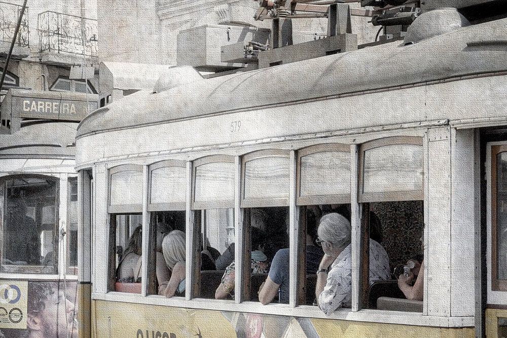 Im Laufe der Zeit ist die gelbe Straßenbahn zu einem Symbol für Lissabon geworden. Wegen der alten Tradition dieser Straßenbahn mischte ich dieses Bild mit einer Tapetentextur, um eine "antike Atmosphäre" zu schaffen. Außerdem habe ich eine etwas mystische Beleuchtung hinzugefügt und das Bild durch eine separate Komposition verzerrt, so dass die Straßenbahn bereits teilweise aus dem Bild verschwunden ist. Außerdem schauen zwei Fahrgäste "interessiert" nach hinten zu dem Mann, der von hinten aus der Straßenbahn ins Bild kommt. Mit diesen vier visuellen Elementen: - dem antiken Ambiente (mit modernen Werbeplakaten) - der ungewöhnlichen Komposition - der Blickrichtung der Fahrgäste und - dem etwas mystischen Lichteinfall im Bild wird eine etwas surrealistische Atmosphäre geschaffen.