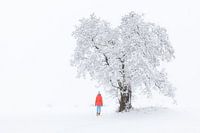 Eine junge Frau mit roter Winterjacke steht neben einem alten Baum in nebliger Winterlandschaft