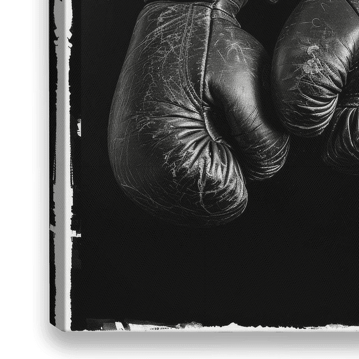 Das Bild zeigt ein Paar abgenutzter, schwarzer Boxhandschuhe, die eindrucksvoll an einer Halterung hängen. Die deutlichen Kratzer und der matte Glanz zeugen von intensiven Kämpfen und harter Arbeit im Ring. Vor dem tiefschwarzen Hintergrund heben sich die Handschuhe stark ab und laden den Betrachter ein, die Geschichten und Erinnerungen…