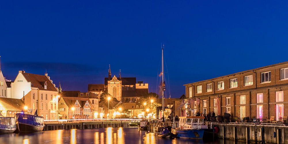 Alter Hafen und die Altstadt von Wismar am Abend, Mecklenburg-Vorpommern, Deutschland.