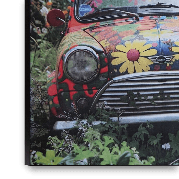 Bestelle das digitale Kunst Bild Alter Mini Cooper mit Hippie Blüten bemalt Sixtees von gm_designs als Reproduktion auf Leinwand, Alu-Dibond, als Poster, Fototapete oder Acrylglasbild.