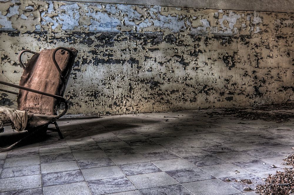 Dies ist ein alter, abgenutzter Stuhl in einer alten Schule in Italien, einem Ort der Urbex-Eploration. Das Zimmer hat einen schönen abgenutzten Boden und weil die Fenster draußen sind, sind viele Blätter hineingeblasen worden.