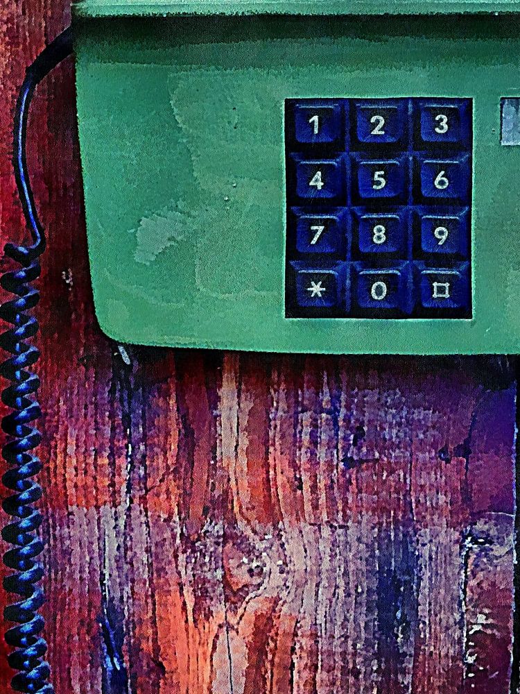 Ein altes Tastentelefon vor einer Holzvertäfelung. Dieses grüne Telefon ist ein Relikt aus der Vergangenheit, mit seiner langen Schnur, die das Mundstück mit dem Hauptteil mit den Tasten verbindet.