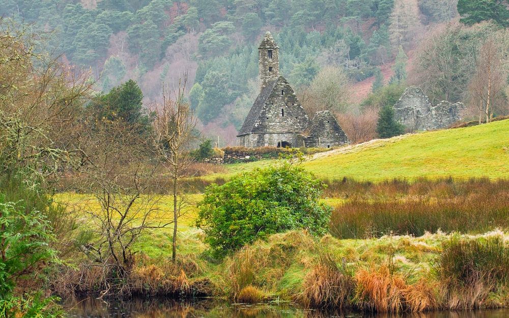 Eine alte Ruine an einem ruhigen Fluss in Glendalough, Irland. Ein schöner Spaziergang in der irischen Landschaft, bei dem man gut entspannen kann.
