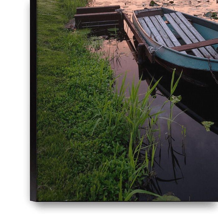 Ein altes hölzernes Ruderboot im Wasser eines kleinen Flusses, umgeben von Seerosen unter einem bunten Himmel bei Sonnenuntergang an einem schönen Sommerabend.