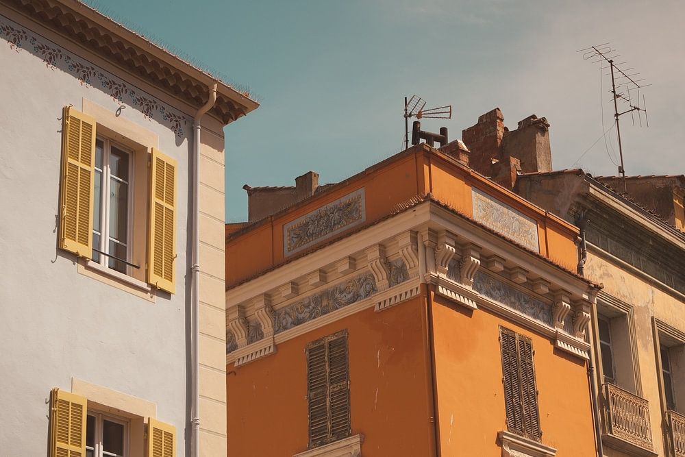 In dieser alten französischen Stadt, Frejus, fangen die charakteristischen alten Gebäude ihre tägliche Sonne ein