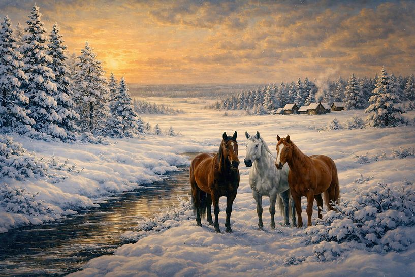 Drei Pferde stehen still in einer Winterlandschaft, am Schnittpunkt von Tag und Abend. Drei Pferde (ein Brauner, ein Weißer und ein Fuchs) stehen an einem Bach in einer verschneiten Landschaft. Ein winterlicher Sonnenuntergang erhellt die Szene. Das weiche Licht der untergehenden Sonne berührt ihre Felle und setzt einen warmen Akzent in…