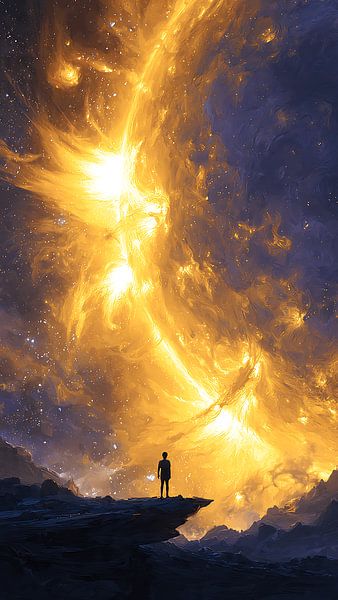 Eine einsame menschliche Silhouette steht auf einer zerklüfteten, schwebenden Felsplattform in den Tiefen des Weltraums und blickt auf eine riesige, glühende Himmelskugel. Der Stern strahlt intensives goldgelbes und feurig orangefarbenes Licht aus, seine Oberfläche ist erfüllt von wirbelnder Energie, Schlieren und leuchtenden Bögen, die…