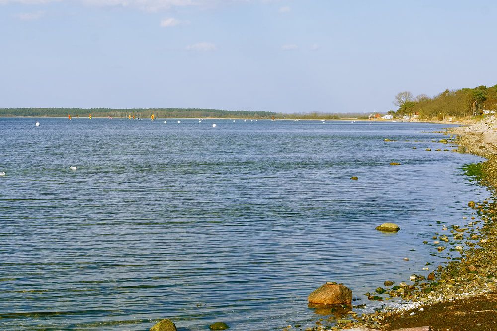 Das Salzhaff liegt südlich der Stadt Rerik in Mecklenburg-Vorpommern, Deutschland, und ist Teil der Ostsee. Hier sieht man die Küste bei Klein Strömkendorf. Aufgenommen im Frühling 2019.