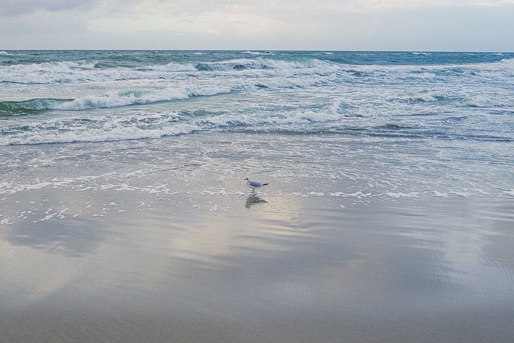 Am Sandstrand der Ostseeküste. Wellen die vom Meer auf die Küste rollen. Sandstrand und Wolken. Landschaftsaufnahme am Meer