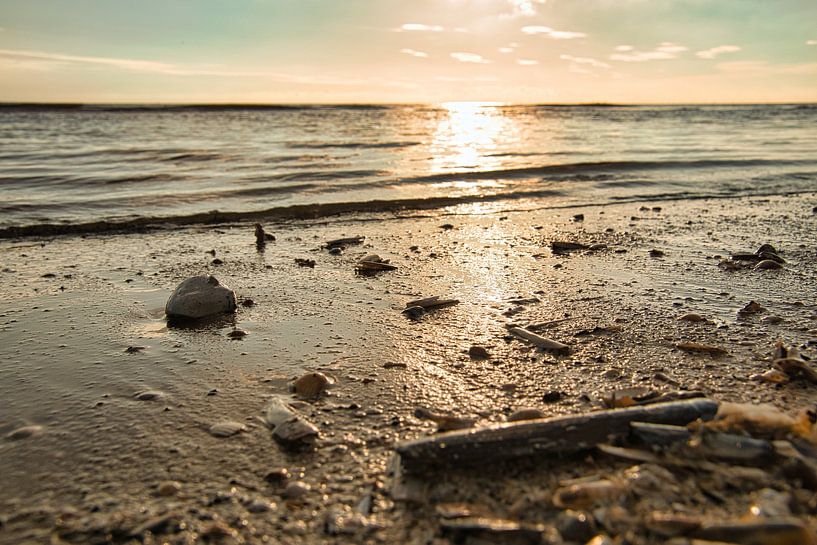 Am Strand von Blåvand im Sonnenschein am Meer. Muscheln im Vordergrund