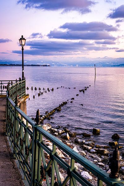 Foto Landschaft mit Ufer und Geländer am Bodensee bei Friedrichshafen Schlosshorn bei blauer Stunde mit Blick auf Schweizer Alpen in Deutschland