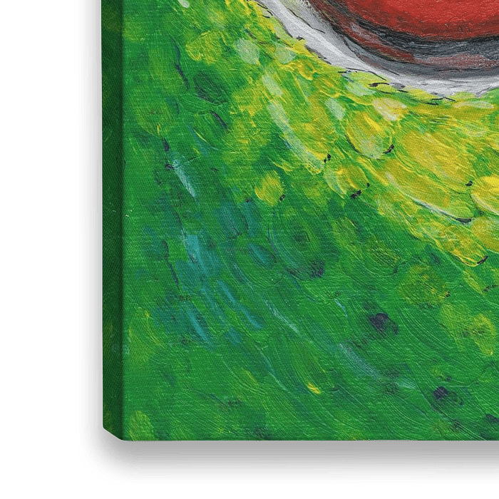 Ein Acrylfarbenanstrich eines roten brennenden Auges. Das Auge ist nah. Es ist das Auge eines Amazonaspapageien. Sie sehen auch einige grüne und gelbe Federn.