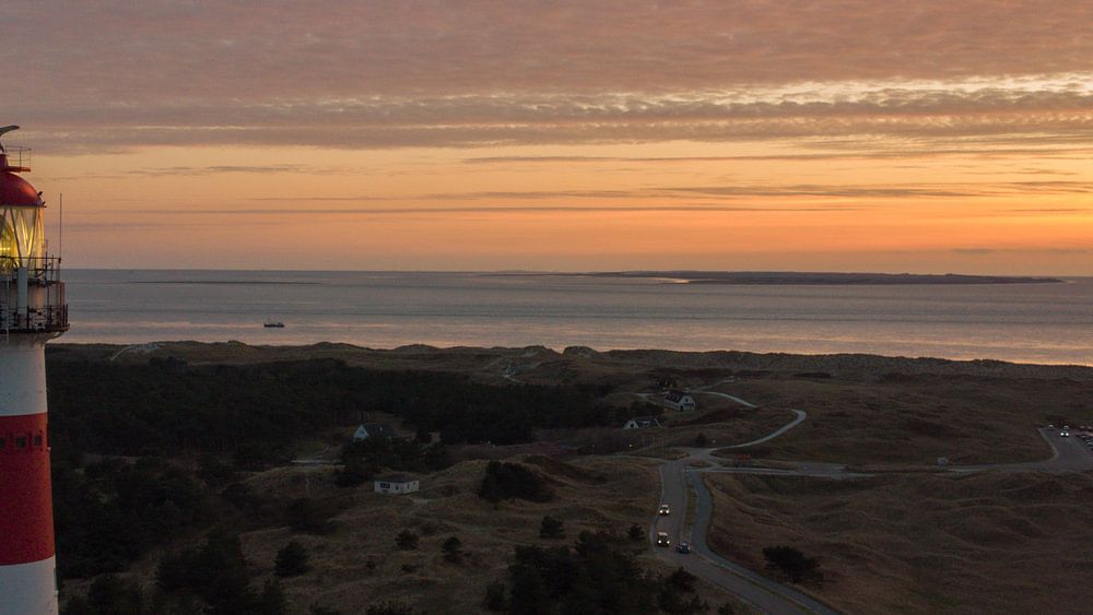 Ameland Drohnenfotografie Der Leuchtturm von Ameland /Hollum während eines schönen Sonnenuntergangs im April mit Terschelling im Hintergrund.