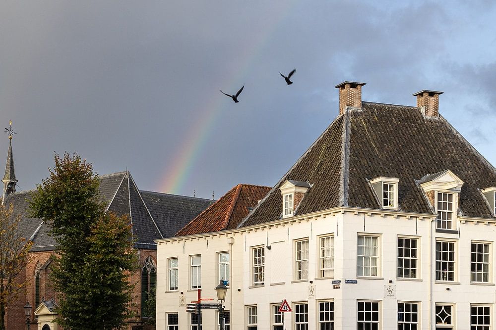 Von der Brücke in der Nähe des Museums blickt man über den Kanal auf diese schönen historischen Gebäude. Im Kanal befindet sich ein Kunstwerk, das zu einer Ausstellung über Wasser gehört, und man kann einen Teil eines Hauses mit einem Dach im Wasser sehen.