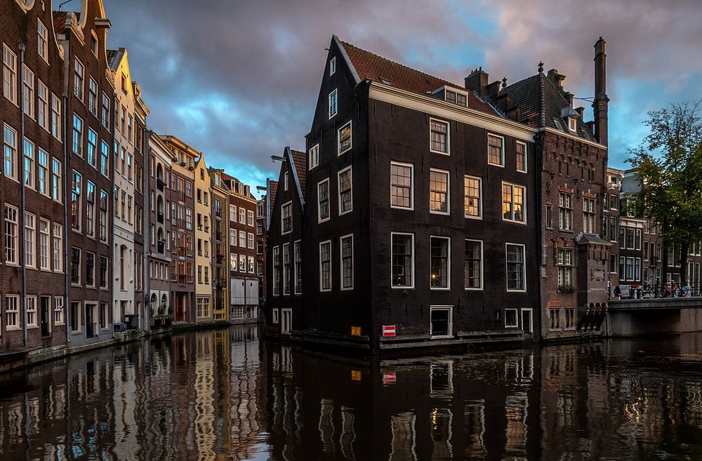 Abendfoto des Oudezijds Burgwal von Amsterdam