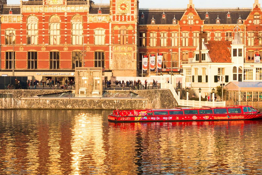Amsterdam Centraal Station in de winter. De laagstaande zon zorgt voor prachtige oranje en rode kleuren. Het licht en het gebouw worden mooi weerspiegeld in het water.