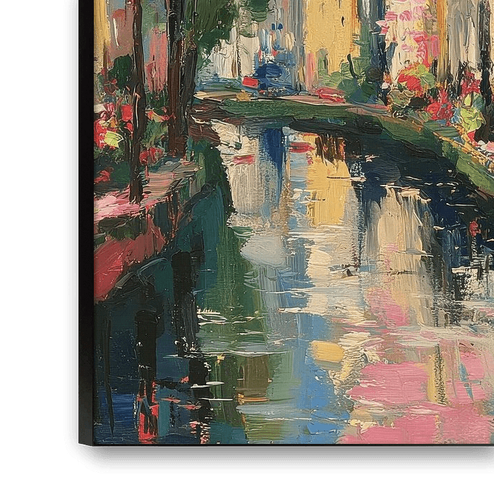 Ein impressionistisch-realistisches Gemälde zeigt einen typischen Amsterdamer Kanal mit schimmerndem Wasser, das die umliegenden Gebäude, Bäume und den Himmel spiegelt. Die Wasseroberfläche glitzert in Blau-, Grün- und Rosatönen, reflektiert die rosa Blüten der Uferbäume. Links ist ein blaues, rechts ein rotes Haus mit weißen Details zu sehen. Ein rosé-beiger Gehweg mit grüner Balustrade verläuft entlang des Kanals. Die Szene wirkt lebendig, harmonisch und stimmungsvoll, mit sichtbaren Pinselstrichen, farblichen Nuancen und ausdrucksstarker Textur, die das besondere Licht und die Atmosphäre Amsterdams einfangen.