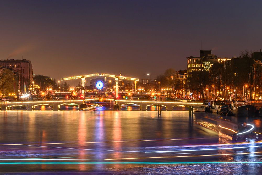 In diesem Foto gibt es Lichtspuren, die während dieser berühmten Veranstaltung von den Booten in Amsterdams Kanälen erzeugt werden. Dieses Winterfestival kehrt jedes Jahr zurück, um die Straßen und Wasserstraßen der Stadt mit bezaubernden Lichtinstallationen internationaler Künstler zu beleuchten. Amsterdam wird zum Schauplatz wundervoller Szenarien, die Tausende von Touristen anziehen