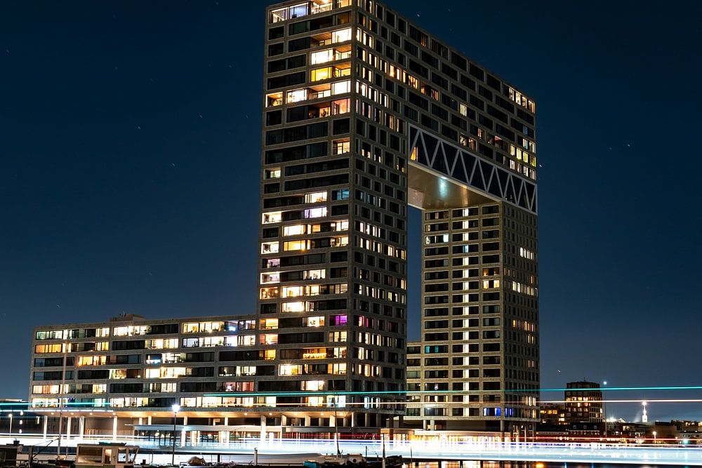 Eine Nachtaufnahme des ikonischen Pontsteiger-Gebäudes in Amsterdam, wo die moderne Architektur vor dem dunklen Himmel erstrahlt. Die Reflexionen auf dem ruhigen Wasser und die Lichtstreifen der vorbeifahrenden Boote schaffen ein dynamisches und futuristisches Stadtbild. Dieses Foto fängt die Ruhe und die Bewegung der Stadt in einem Bild ein und ist perfekt für Liebhaber der Stadtfotografie und der architektonischen Schönheit.