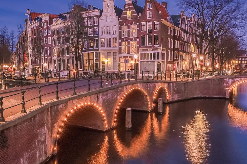 Amsterdam bei Nacht. Ein Blick auf die Ecke Keizersgracht und Leidsegracht. Links ist in der Ferne die Westerkerk zu sehen. Bei der Aufnahme dieses Bildes am Abend sind die Brücken und Straßenlaternen wunderschön beleuchtet. Ein schönes Stadtbild unserer Hauptstadt.