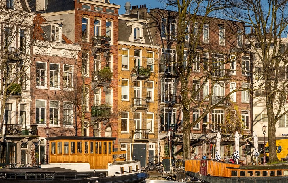 Ein ikonisches Grachtenfoto entlang des Flusses Amstel in Amsterdam. Dieses Foto wurde an einem schönen Wintertag aufgenommen. Ein schönes Stadtbild mit schöner Reflexion. Sieht an jeder Wand perfekt aus!