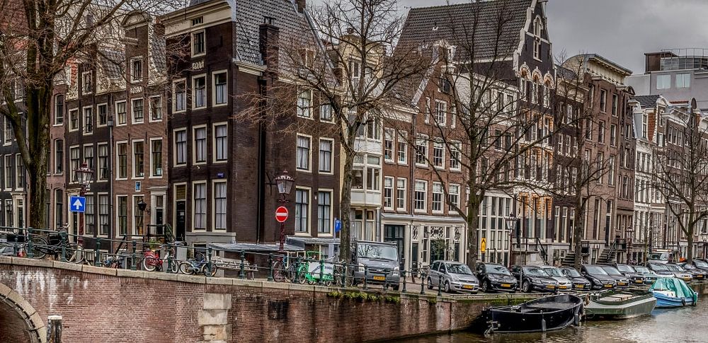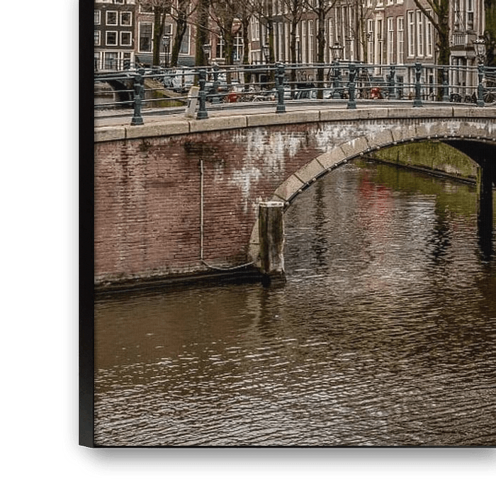 Bild einer der Kreuzungen der Grachten in Amsterdam. Ein bekannter Ort mit einigen schönen historischen Häusern entlang der Kanäle. Dunkle Wolken verleihen diesem Bild etwas Dramatisches. Wäre schön an Ihrer Wand!