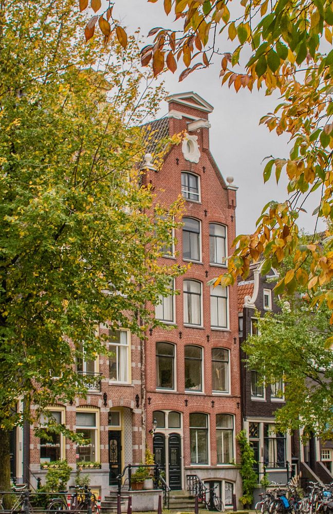 Stadtzentrum Amsterdam. Die Brouwersgracht zu Beginn des Herbstes mit Villen im Hintergrund