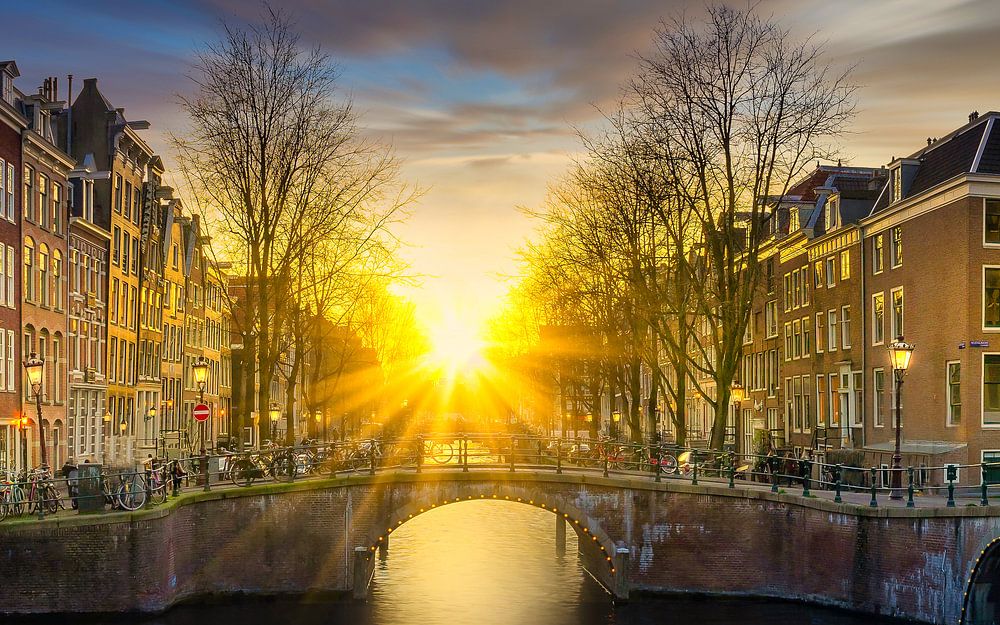 Amsterdamer Grachten mit Sonnenuntergang. Nordholland, Niederlande, Hauptstadt, Brücken