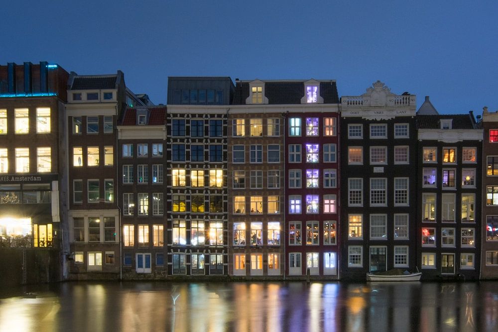 Niederländische Grachtenhäuser am Damrak, schöner geht es nicht. Das Foto wurde im Dunkeln aufgenommen, so dass die Beleuchtung der Häuser magisch wirkt. Die Reflexion im Wasser des Kanals und vervollständigt das Bild wirklich.