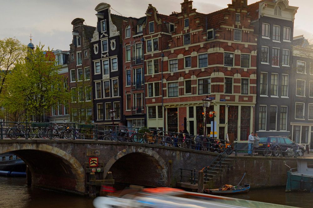 Aufnahme einiger typischer Amsterdamer Grachtenhäuser an der Brouwersgracht und Prinsengracht, in der Nähe der Papiermolensluis, im Zentrum von Amsterdam. Ein Ausflugsboot fährt im Vordergrund vorbei und die Sonne geht langsam hinter den Bäumen im Hintergrund unter; Amsterdam, Niederlande