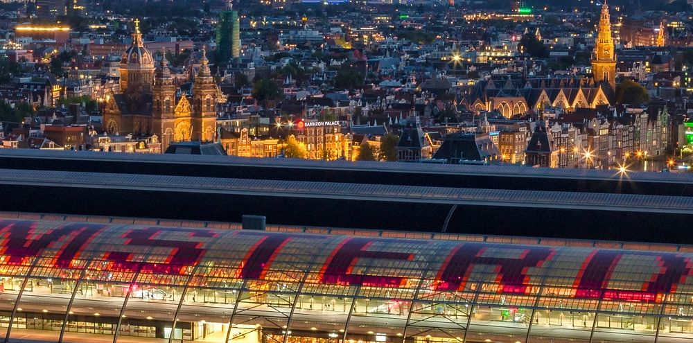Blick im Abendlicht auf den Fluss IJ und die Stadt Amsterdam mit dem Amsterdamer Hauptbahnhof im Vordergrund, vom ADAM-Turm aus gesehen.