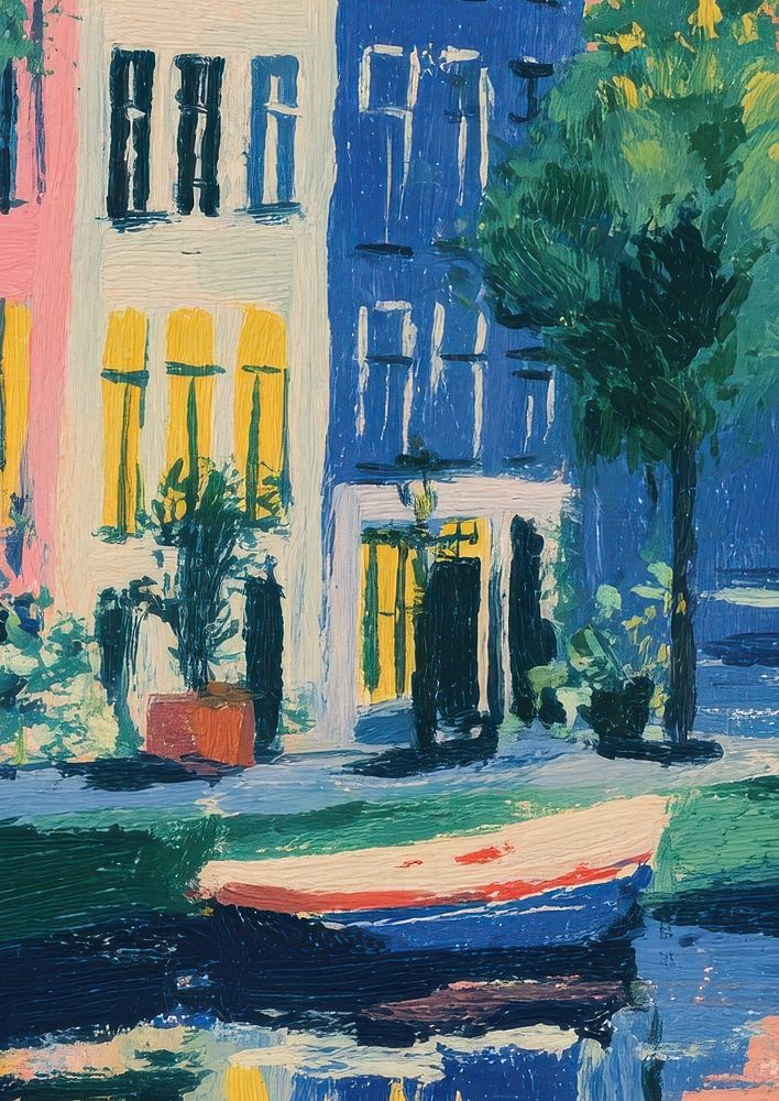 Dieses Gouache-Gemälde zeigt einen Amsterdamer Kanal mit farbenfrohen Häusern und ihren Spiegelungen im Wasser. Ein Boot mit Schatten liegt vor einem der Häuser, während der Himmel in sanften Pinktönen des Sonnenuntergangs leuchtet. Kräftige, expressive Pinselstriche und leuchtende Farben im Stil von Henri Matisse betonen Form und Tiefe der Szene. Die Kombination aus Architektur, Wasserreflexionen und dynamischer Farbgestaltung vermittelt Lebendigkeit, Harmonie und eine künstlerische Interpretation des urbanen Kanalmotivs. Klare Linien, kräftige Kontraste und lebendige Farben fangen die charakteristische Stimmung Amsterdams auf eindrucksvolle Weise ein.