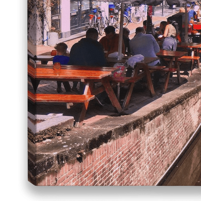 Auf diesem Foto haben wir versucht, das Bild von Amsterdam einzufangen. In der Mitte ein Wassergraben, links Terrassen und rechts Häuser.
