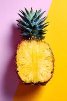 Eine halbierte Ananas schwebt zentral vor einem diagonal geteilten Hintergrund in Pink und Gelb. Die saftige, leuchtend gelbe Innenstruktur kontrastiert mit der rauen, grünen Krone und der strukturierten Schale. Das Licht betont Frische und Feuchtigkeit, während die klare, grafische Komposition fast werblich wirkt. Die Stimmung ist…