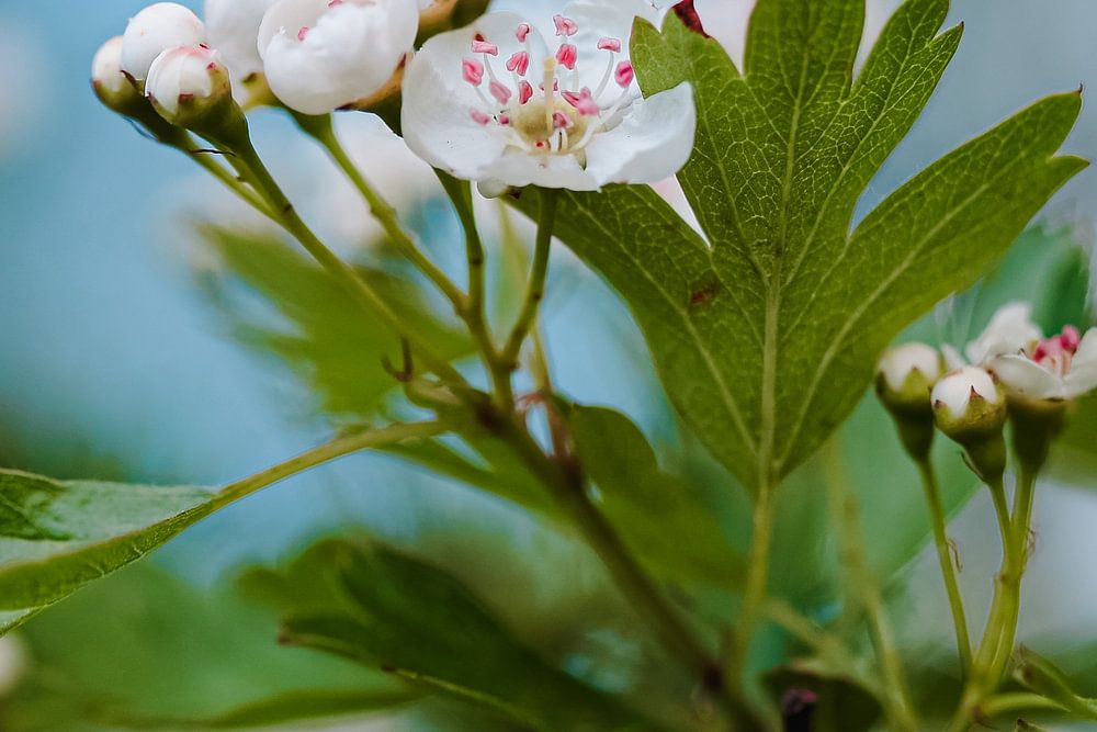 Der Frühling zeigt sich von seiner besten Seite. Frische junge Blätter mit Blüten und ihren rosafarbenen Stempeln, bereit, von den Bienen mitgenommen zu werden.