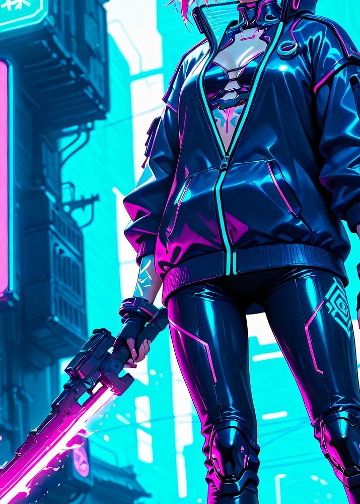 Neon Oni Vanguard verwandelt den mythischen japanischen Oni in eine futuristische Beschützerin der Neon-Metropole. Sie trägt einen eleganten Kampfanzug und eine Jacke mit leuchtenden Schaltkreisen und hat ein mächtiges Plasmakatana dabei, das magentafarbenes Licht ausstrahlt. Ihre Hörner leuchten vor den hoch aufragenden Wolkenkratzern und symbolisieren sowohl Stärke als auch Trotz. Dieses Kunstwerk fängt die Verschmelzung einer alten Legende mit der Ästhetik des Cyberpunk ein und zeigt eine Kriegerin, die das Gleichgewicht zwischen Chaos und Ordnung in einer hochtechnisierten Welt verteidigt.