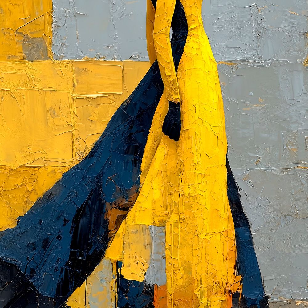 Ein Kunstwerk mit der Silhouette einer Frau in einem gelben Kleid vor einem Hintergrund aus gelben und grauen Flächen. Das Gemälde zeichnet sich durch kräftige Pinselstriche und einen abstrakten Stil aus, der die Eleganz und Bewegung der Frau hervorhebt.