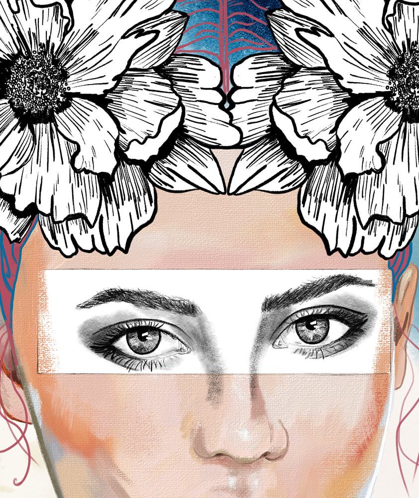 Porträt einer Frau, Schmetterling und Blumen mit einem Hintergrund aus gemischten Medien.