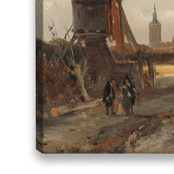 Im 19. Jahrhundert wurde Rembrandt zum Nationalhelden der Niederlande. In Amsterdam wurde er mit einer Statue geehrt. Für die festliche Enthüllung wurde der Park Hall mit großen Gemälden der Städte geschmückt, in denen er gearbeitet hätte. Dies ist die Skizze für das Rembrandt-Gemälde in Den Haag. In der Ferne liegt die Stadt mit dem Turm der Grote oder der Sint-Jacobskerk. Erst später stellte sich heraus, dass Rembrandt in Den Haag nie gearbeitet hatte.