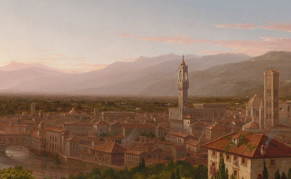 Cole besuchte Italien im Jahr 1831 und fertigte eine kleine Bleistiftskizze dieses Ausblicks auf Florenz kurz vor Sonnenuntergang an. In seinem New Yorker Atelier verwandelte er die Zeichnung sechs Jahre später in dieses große Ölgemälde und fügte malerische Menschen und Ziegen in den Vordergrund.