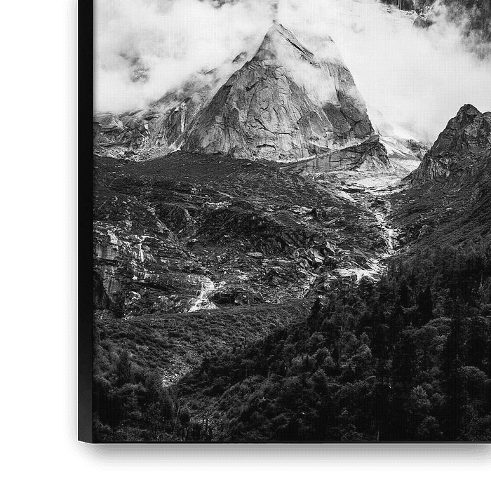 Die zerklüfteten Felsen des Berggipfels sind deutlich sichtbar und heben sich scharf von der weichen Struktur der Wolken ab. Der Berg Siguniang, auch bekannt als die "Vier Schwestern", ist einer der höchsten Berge in der Region und bekannt für seine beeindruckenden Gipfel und anspruchsvollen Kletterrouten. Durch die Wahl von Schwarz und Weiß kommen die Kontraste zwischen dem dunklen Berg und den hellen Wolken noch besser zur Geltung.