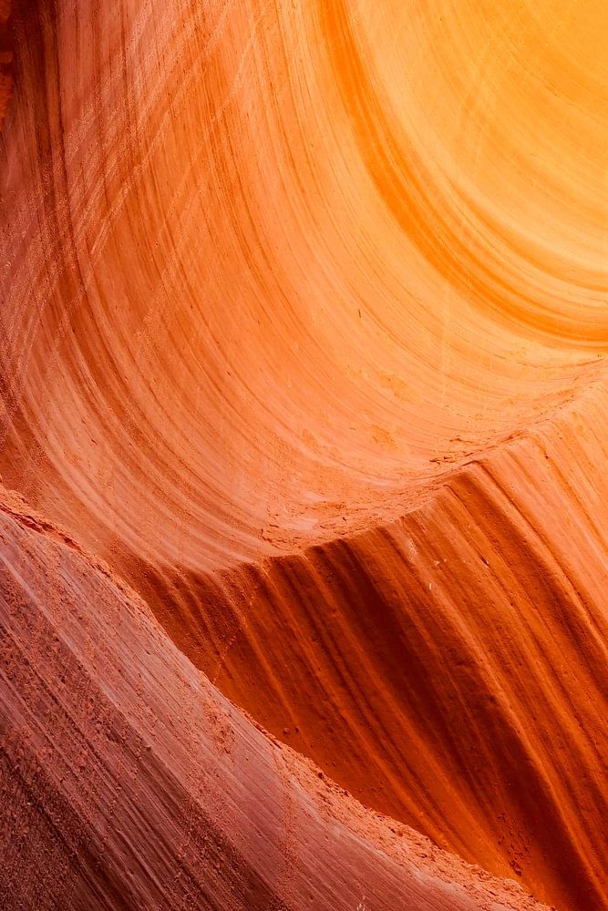 Der Lower Antelope Canyon ist ein Abenteuer in einer wundersamen unterirdischen Welt. Dieses Foto zeigt eine der vielen raffinierten Felsformationen, die man im Slot Canyon findet. Ein helles Foto mit vielen Details, gelben und roten Highlights und vielen Linien durch die geologische Geschichte dieses Canyons. Wunderschön schattiert durch das Licht, das von oben in den Canyon scheint.