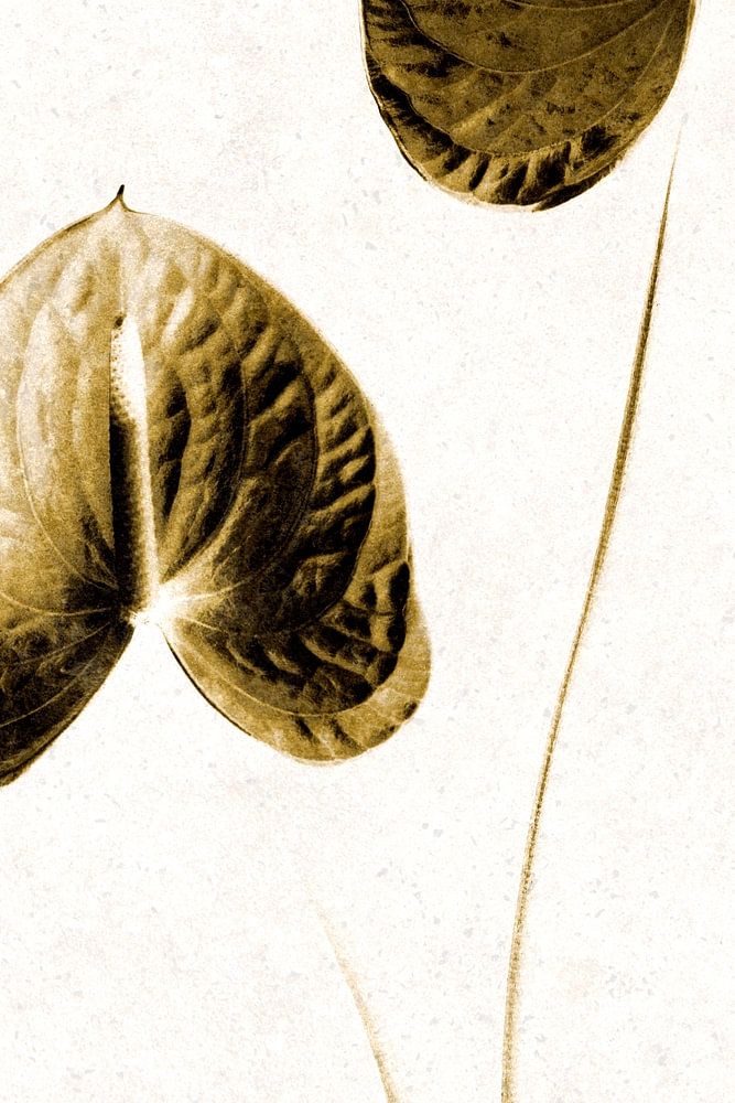 Zwei zierliche Anthurium-Blüten in monochromem Schwarz und Weiß mit goldenem Schimmer.