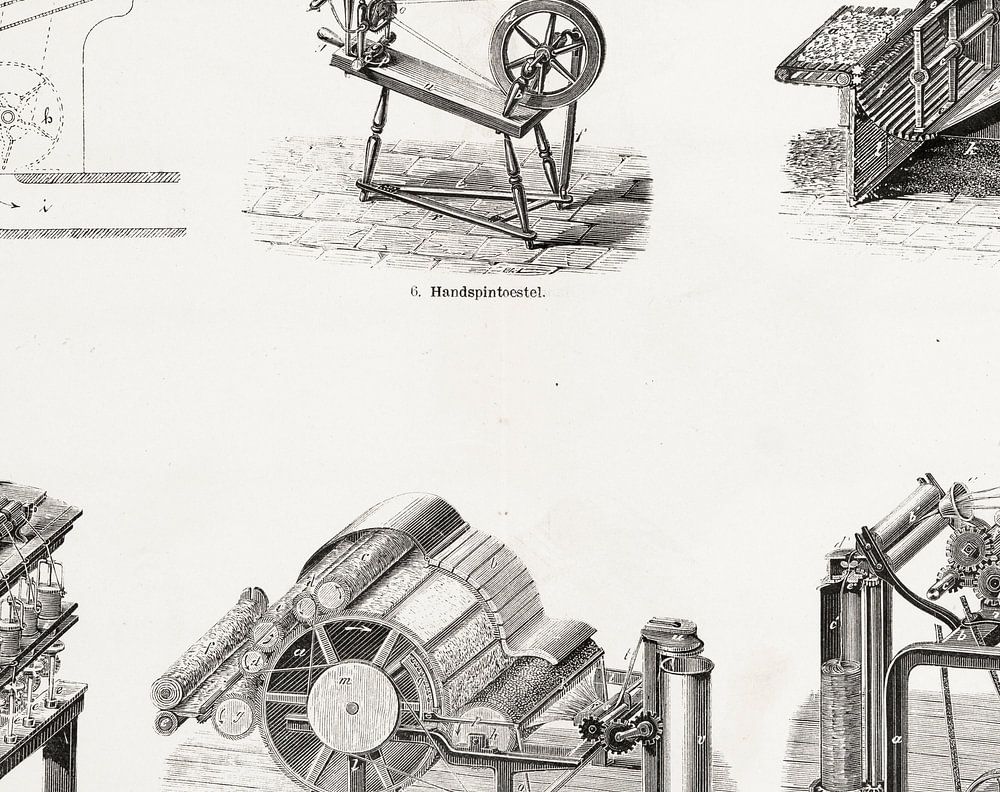 Dieser alte Stich zeigt eine Reihe von mechanischen Spinnmaschinen und damit verbundene Maschinen wie eine mechanische Karde.