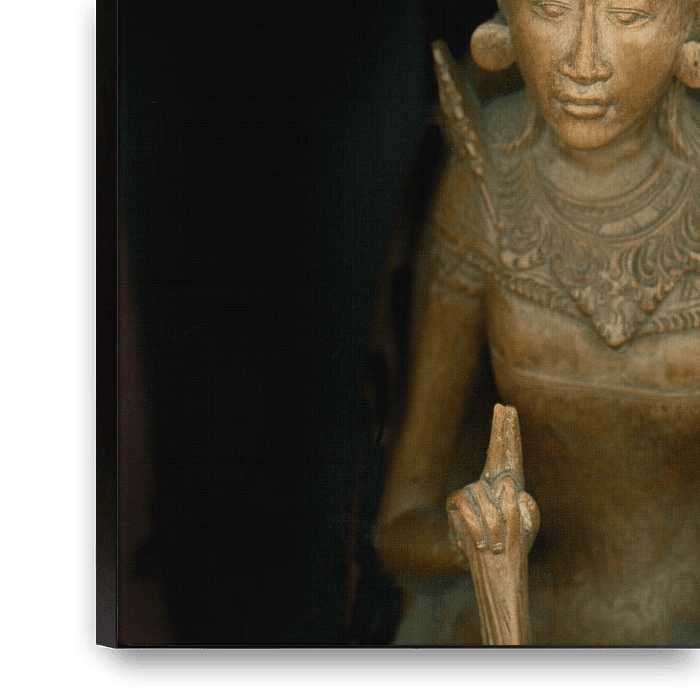Ein digitales Foto einer antiken Holzskulptur aus Bali. Wahrscheinlich Sandelholz. Von der Zeit schön verwittert. Vor einem schwarzen Hintergrund.