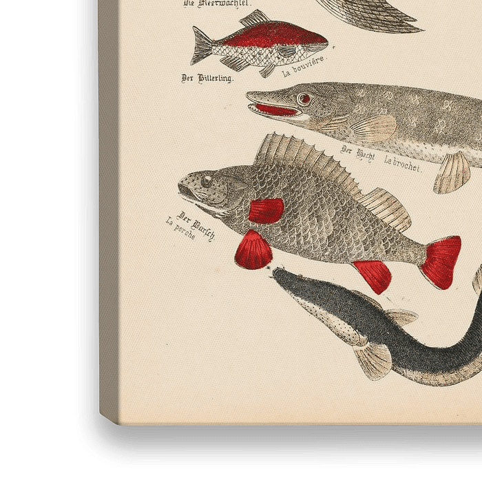 Dies ist eine Reproduktion einer sehr alten Schulplatte, die eine wunderbare Sammlung von Süß- und Salzwasserfischen zeigt. Es handelt sich um einen Vorläufer der Lithografietechnik, der Druck stammt aus der Zeit um 1875. Die Zeichnungen sind naiv gestaltet.