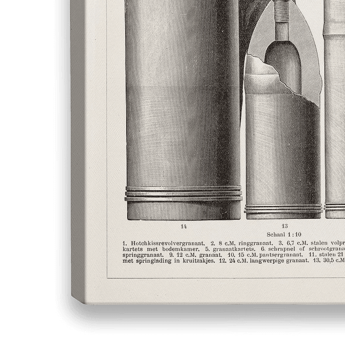 Diese alte Gravur zeigt 14 Granaten, die von der Artillerie abgefeuert werden können. Aus Gründen der Proportion und Größe ist ein Soldat neben den Granaten abgebildet.